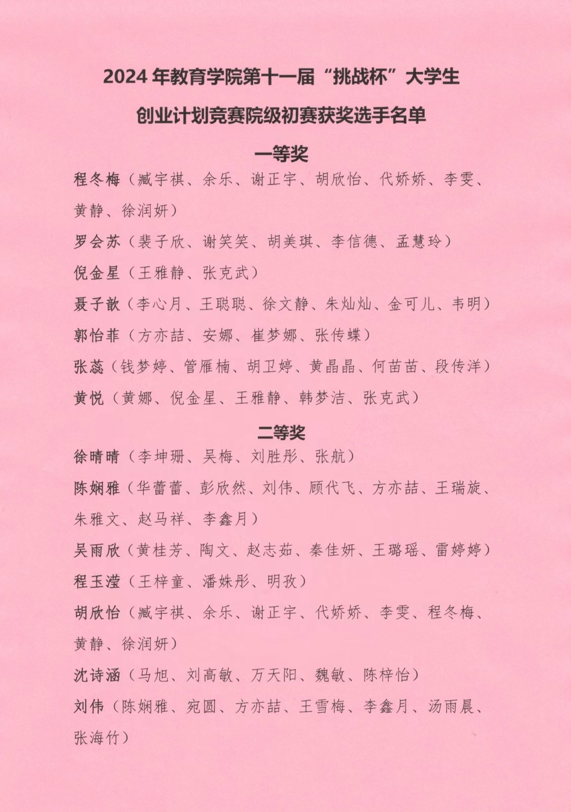 2024年kaiyun开云官方第十一届“挑战杯”大学生创业计划竞赛院级初赛获奖选手名单