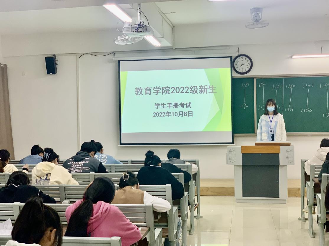 为使2022级新生尽快适应学校的教育教学和生活秩序,帮助新生知悉学校的各项规章制度,树立良好的行为规范,kaiyun开云官方在组织新生学习学校各项管理规定的基础上,于2022年10月8号晚在1号教学楼开展新生《学生手册》应知应会知识点考试,全院49个新生班级近200名同学参加了考试,全体新生辅导员担任监考工作,学院分管副书记孟向红和团总支负责人黄莹莹担任巡考检查工作。