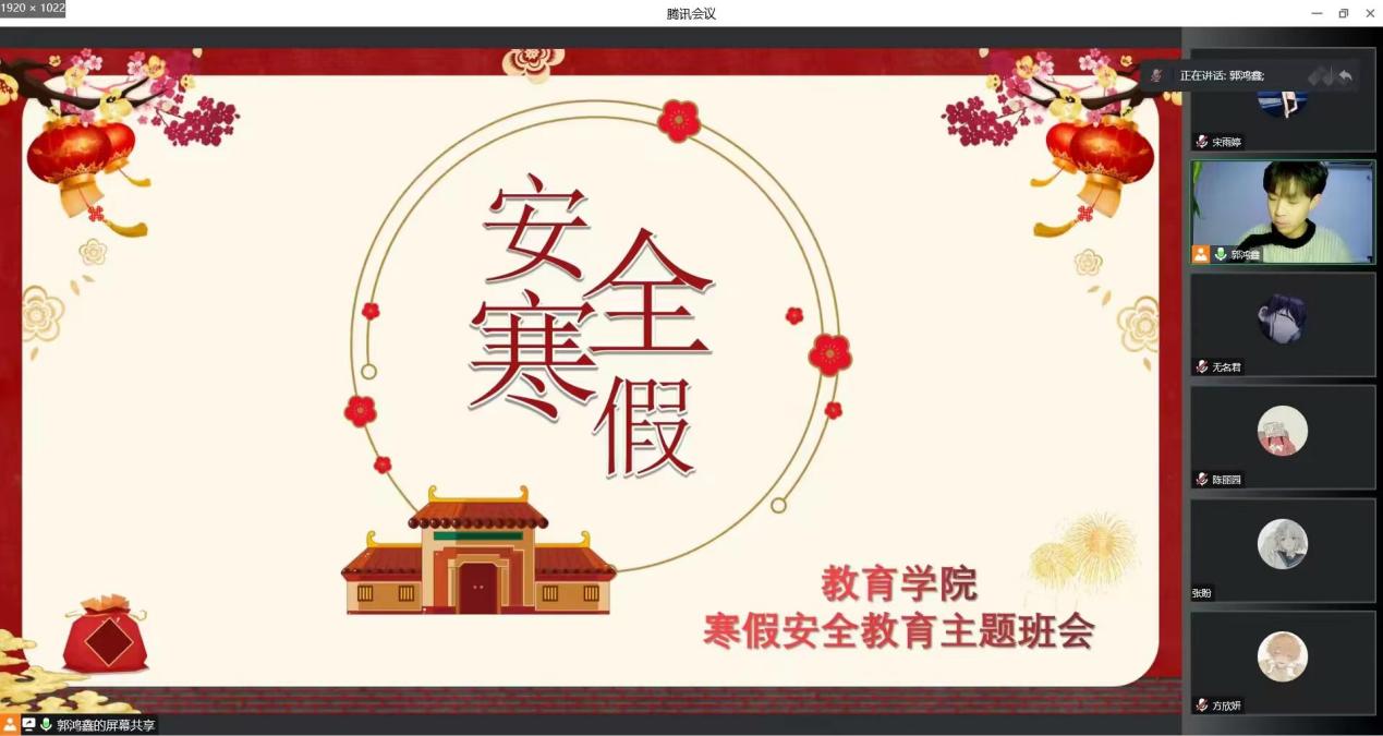 为进一步做好学生假期安全教育工作,落实安全教育的常态化,保障假期安全工作不松懈,确保同学们度过一个平安、快乐、有意义的寒假,2023年1月14日,kaiyun开云官方全体辅导员组织各班同学开展了线上寒假安全教育主题班会活动。