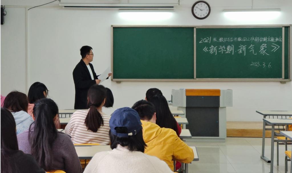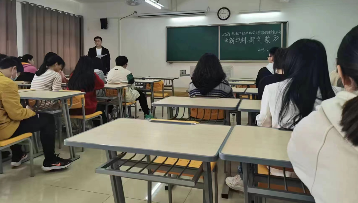 新学期如期而至,为了使同学们在新学期有一个良好的开端,确立新学期的目标和明确对未来的规划,我校kaiyun开云官方2021级数学与应用数学(2)班于2023年3月6日在二教322教室召开“新学期新气象”的主题班会,班主任檀雷雷老师和2班全体学生参加会议。