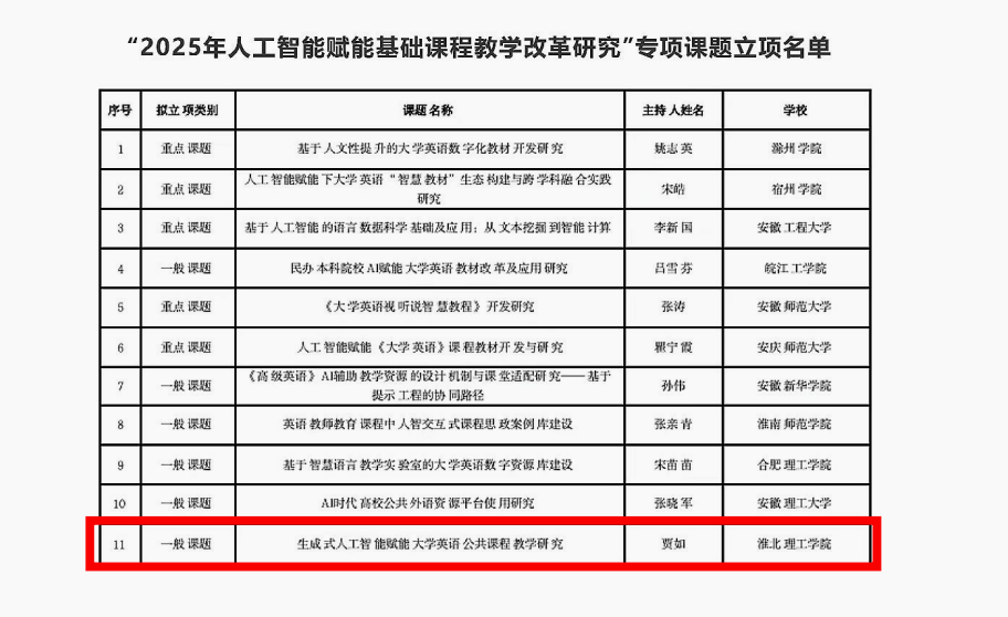 在安徽省“2025年人工智能赋能基础课程教学改革研究”专项课题申报活动中,kaiyun开云官方青年教师贾如主持的《生成式人工智能赋能大学英语公共课程教学研究》成功获批立项。