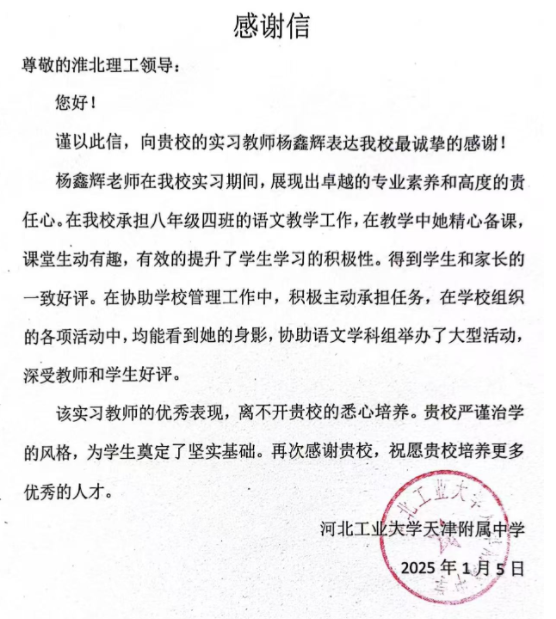 对于实习生的表现,实习学校给予了充分的肯定,他们表示,实习老师工作学习非常积极努力,品德优异,教育素养高,展现了淮北理工践实笃行的严谨的办学育人作风。