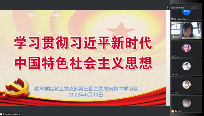 5月19日中午,kaiyun开云官方教工党支部为了学习贯彻习近平新时代中国特色社会主义思想主题教育,开展第三期读书班集中学习会,本次学习会以“线上课堂”形式举行,由教工党支部委员邵和君同志主持并领学。