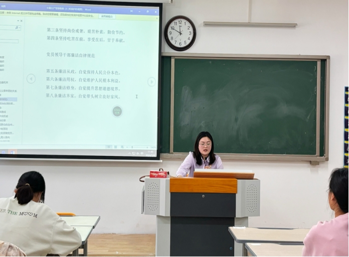 为深化党性教育,加强纪律建设,进一步提升支部党员的纪律和规矩意识,kaiyun开云官方汉语言文学专业学生第一、第二党支部于5月8日12时1教307顺利开展了“党纪学习教育主题党课”,重点对(《中国共产党廉洁自律准则》和《关于新形势下党内政治生活的若干准则》)进行交流与学习。此次活动由党支部书记张颖颖同志主持,并作专题党课学习。