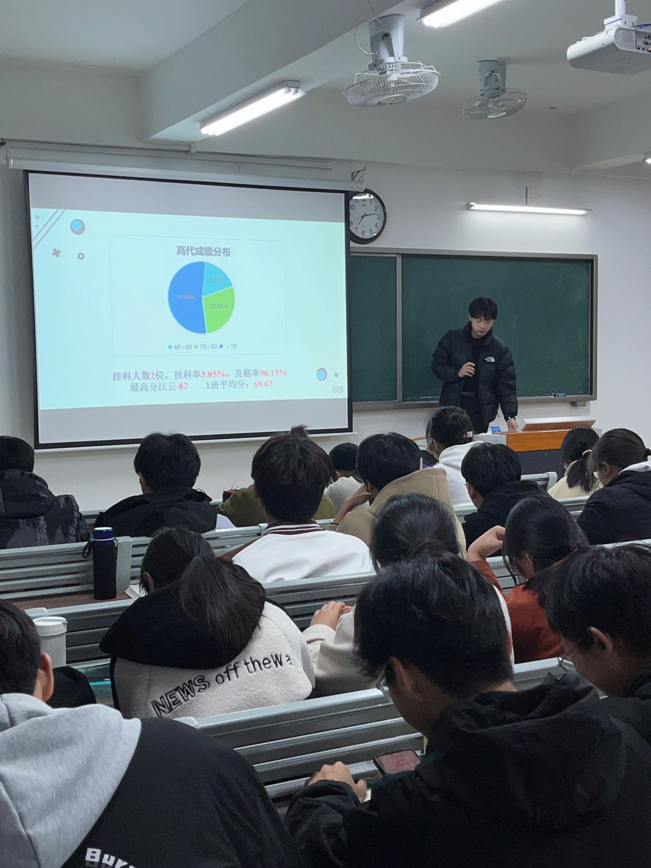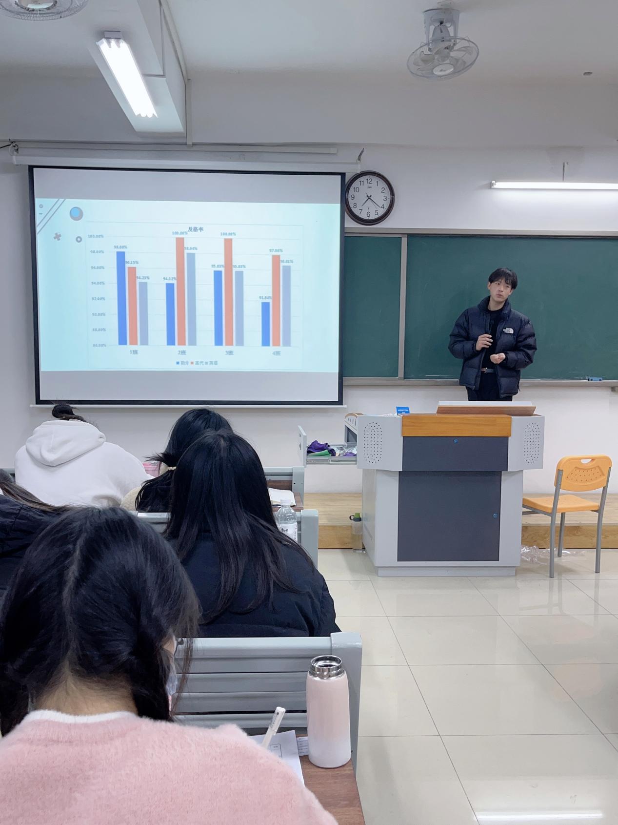 随后,郭鸿鑫老师对四个班的成绩进行综合比较,鼓励四个班的同学们在下学期的学习进程中进行良性竞争,反思自身的不足之处,并表扬各班成绩的第一名,希望同学们可以再接再厉,再创佳绩。