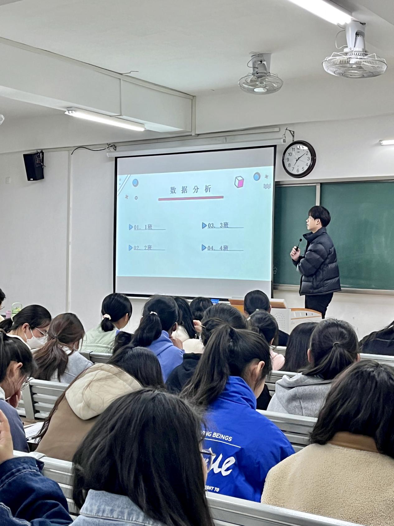 郭鸿鑫老师首先对各班的期末考试成绩进行总结,针对数学分析、高等代数和大学英语三门课程对4个班分别进行及格率、挂科率、平均分、成绩分布等数据分析。并提醒各班同学应保持优势科目的现有水平,注重薄弱科目的查缺补漏,多向优秀的同学学习,并鼓励同学们多与任课老师进行沟通,在班级成立学业互助小组,共同进步。