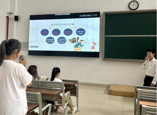他首先向同学们列举了身边常见的电信诈骗手段,与现场同学进行互动;同时,就近期发生的校园诈骗推销事件进行剖析,引导同学们杜绝一切形式的推销行为,并介绍了预防电信诈骗的方法。