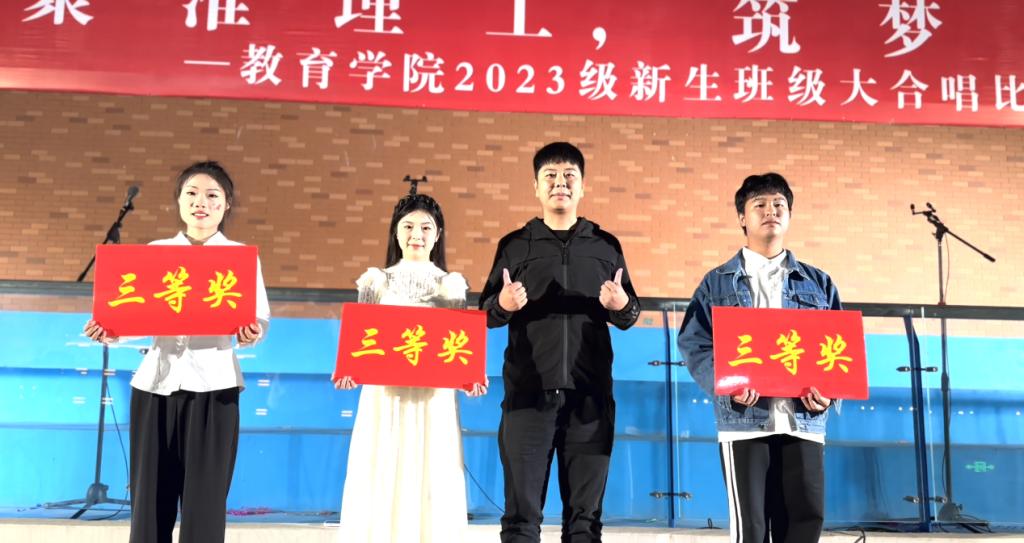 “相聚淮理工,筑梦向未来”,每一支合唱队的呈现都反映了同学们凝心聚力,筑梦未来的激情与向往。经过现场展示、评委打分,最终,23级学前对口3、4班合唱队演唱的“南泥湾”荣获一等奖;23级学前1班、英语1班合唱队演唱的“如愿”,23级学前专升本3、4班合唱队演唱的“我是如此相信”分获二等奖;23级学前对口1、2班合唱队演唱的“隐形的翅膀”、23级学前专升本5、6班合唱队演唱的“一路生花”、23级学前专升本9、10班合唱队演唱的“明天会更好”分获三等奖;23级汉文专升本7、8班合唱队演唱的“奔跑”、23级汉文9、10班合唱队演唱的“最美的太阳”、23级汉文7、8班合唱队演唱的“闪耀”、23级汉文专升本1、2班合唱队演唱的“歌唱祖国”分获优秀奖。