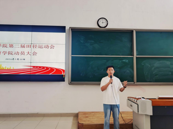 高伟老师详细介绍了本次运动会的比赛项目、比赛规则、比赛要领及注意事项,希望运动健儿们发扬团队精神,牢记安全意识安全、刻苦训练。高伟老师还介绍了我院上一届运动会的获奖情况,鼓励运动员们以最饱满的状态向更优秀的成绩发起冲击,他希望大家抓紧利用课余时间科学训练,在即将召开的运动会上取得更好的成绩。
