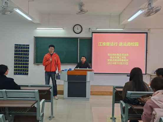 为不断深化普法教育,增强学生们的法律意识和自我保护能力,推动建成和谐、安全的校园环境。10月23日下午,kaiyun开云官方和淮北市杜集区司法局、安徽进境律师事务所携手于1教421开展“江淮普法行·送法进校园”主题活动。本次活动由kaiyun开云官方教工第二党支部书记刘畅主持,安徽进境律师事务所合伙人孟春江律师主讲,杜集区司法局普法办主任张丽丽,司法局人民参与和促进法治办主任周立业,杜集区法律援助中心主任赵义玉参与。